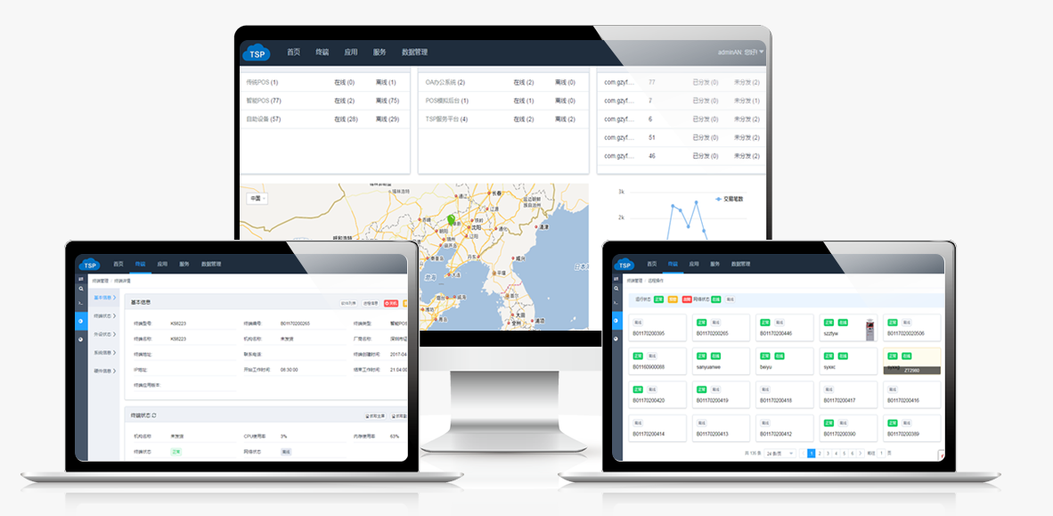 交易統(tǒng)計(jì)、終端地圖、應(yīng)用管理、智能監(jiān)控……功能按需定制,操作一目了然